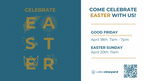 Easter is right around the corner and we are so excited to host our easter service right here at the Valley Vineyard! Join us for Good Friday April 18th any time between 7am-7pm to participate in stations of the cross. This experience last about an hour so keep that in mind when stopping by. That following Sunday we will be celebrating Easter at 11am, see you then!